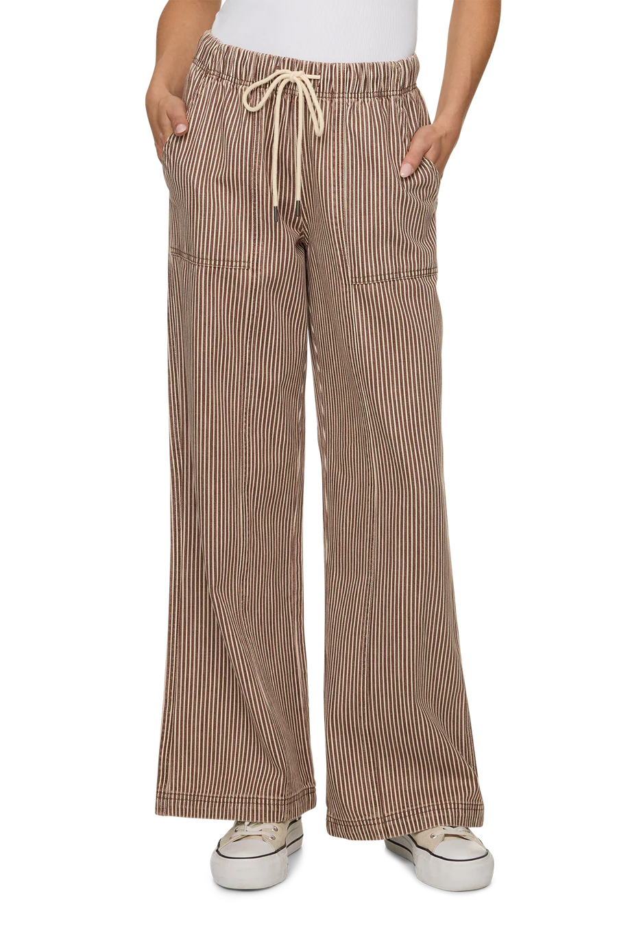 Made from a cotton blend with a hint of comfy stretch, these effortless wide leg pants feature an elasticized waistband with adjustable drawstring and front patch pockets. This is a lounge pant that makes it easy to choose cute comfort that you can leave the house in. The vertical stripe adds cool-girl style!