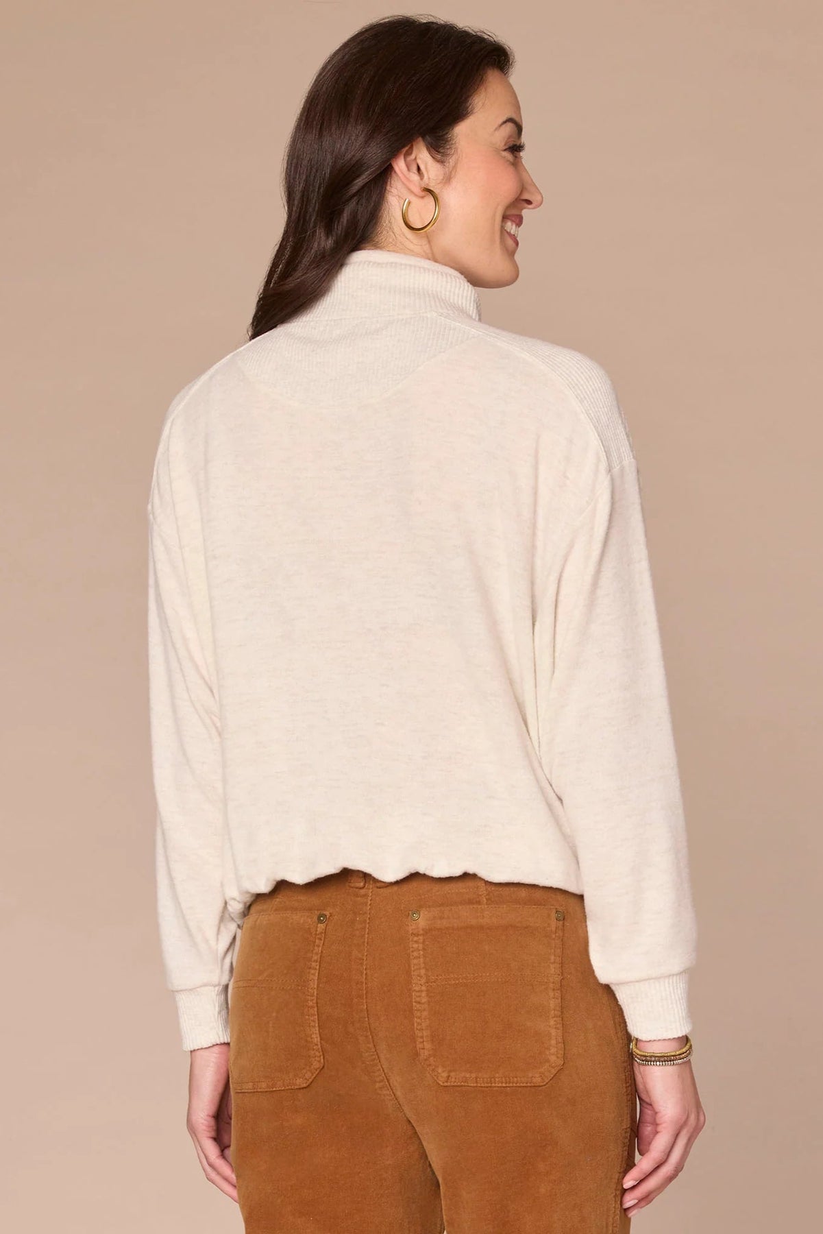 Warm and cozy, this mixed media top features a stand collar with adjustable tie, long sleeves and a kangaroo pocket. This top is easy to style and the slightly cropped bubble hem provides a unique finish. Pair this relaxed fit look with jeans, trousers or your favorite joggers.
