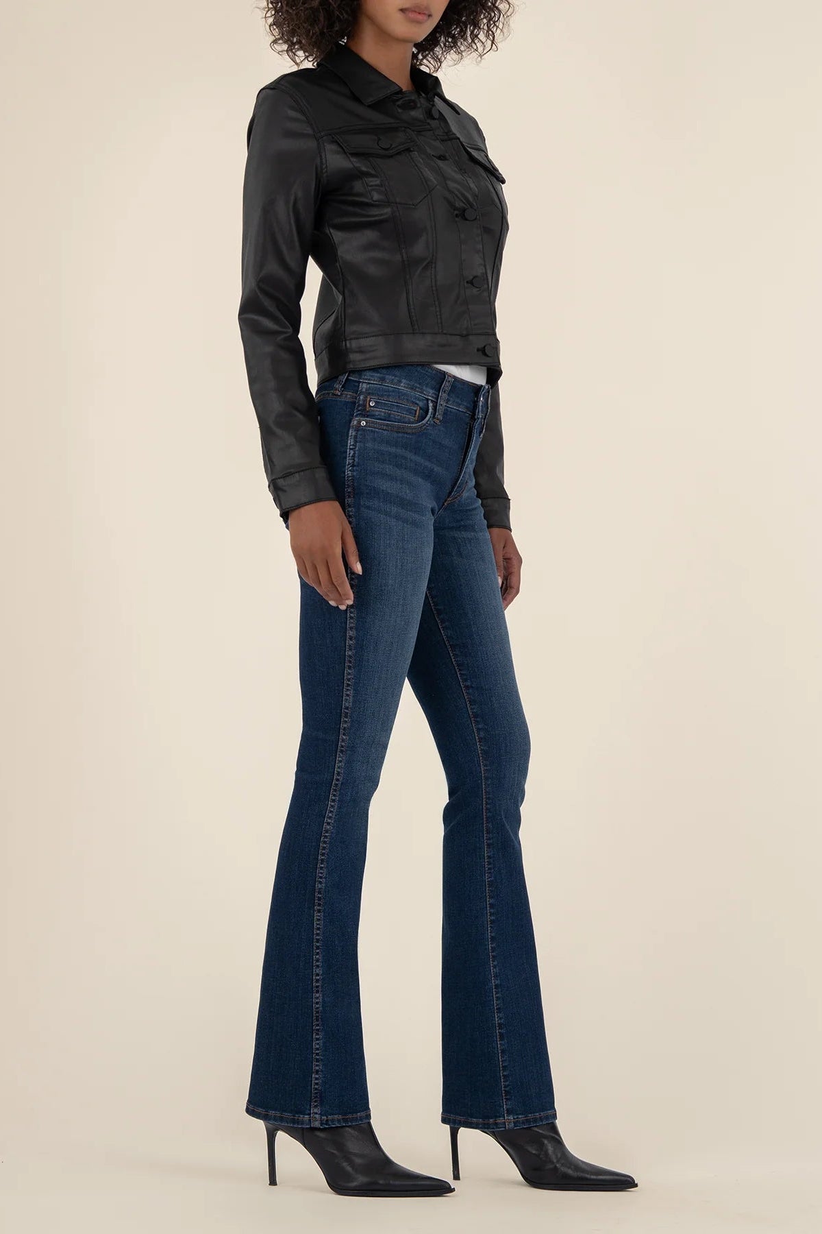 The trucker jacket is always a classic style, and this year we're seeing some updated versions. This one is sure to catch your eye with it's slightly cropped length and lightweight coated denim. Throw this layer on for an elevated casual look that is easily worn to the office, date night or weekend brunch.