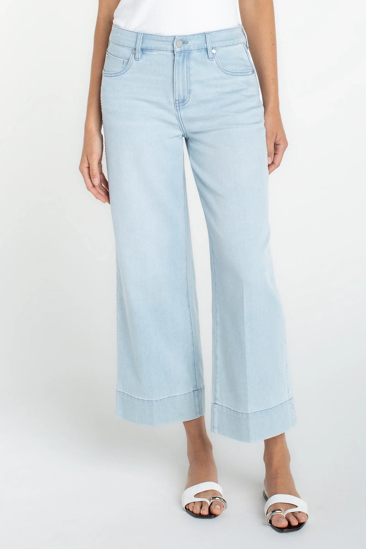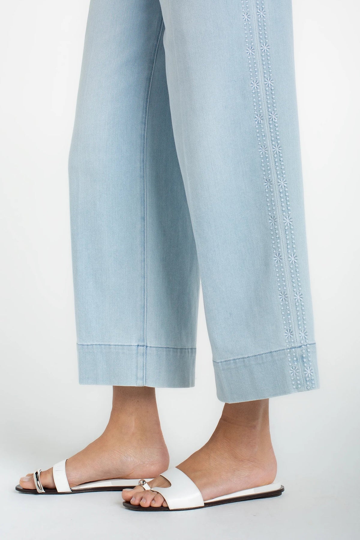 This jean features a delicate embroidered floral detail at the side seam and wide crop leg, making them a trendy addition to your spring to summer wardrobe. The light washed finish and mid rise fit embody comfort and versatility. You will love this relaxed, mid-rise cropped pant!