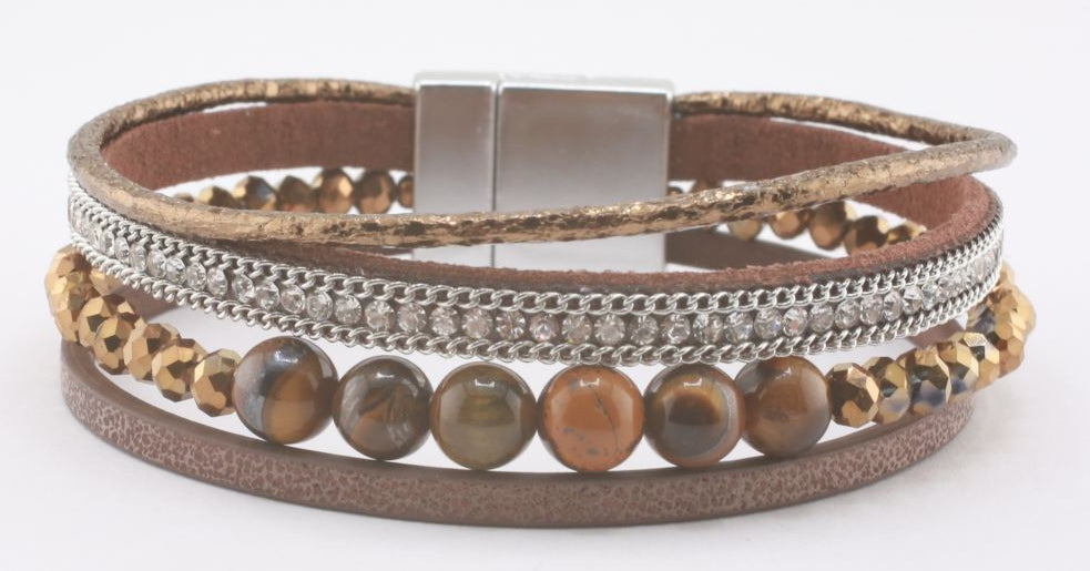 Round beads, colored and clear crystals with faux leather bands. Magnetic clasp closure.
