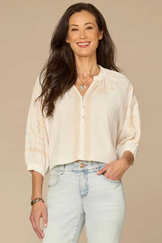 This top is naturally feminine and chic. The off-white, mixed-media embroidery and ruffle stand collar are details that enhance the boho look and feel. Perfect for a morning spent brunching and thrifting!
