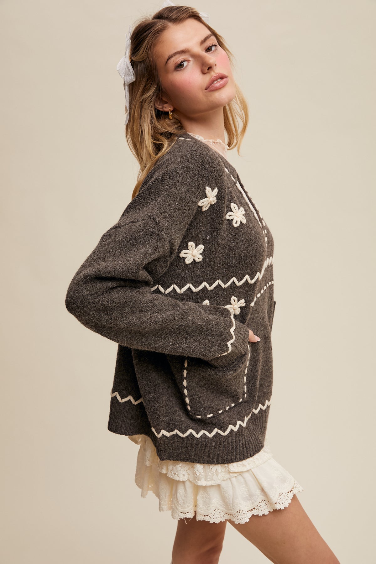 The slouchy silhouette makes this sweater ideal for layering. Embellished with 3D floral applique, the look is decidedly charming and playful. Featuring a deep notch v-neckline with contrasting whip stitching, front patch pockets and relaxed drop shoulders - the details are just delightful.
